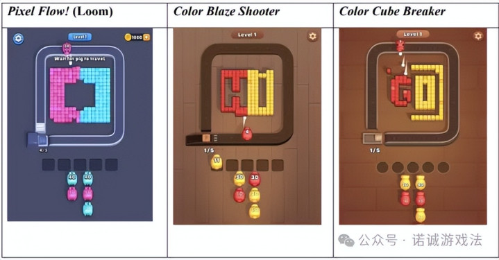 被控侵权欺骗包括 Color Blaze Shooter 与 Color Cube Breaker(亦以 Color Pixel Shooter 称号分发)。原告在诉状中指出,被告在多个要津运筹帷幄层面复制了 Pixel Flow! 的抒发。